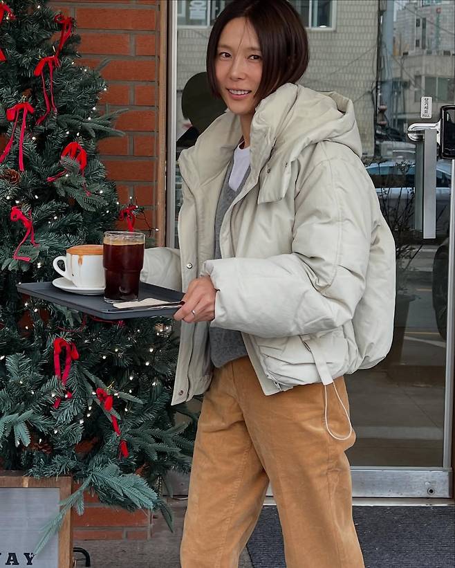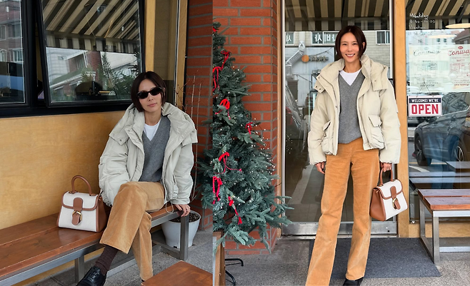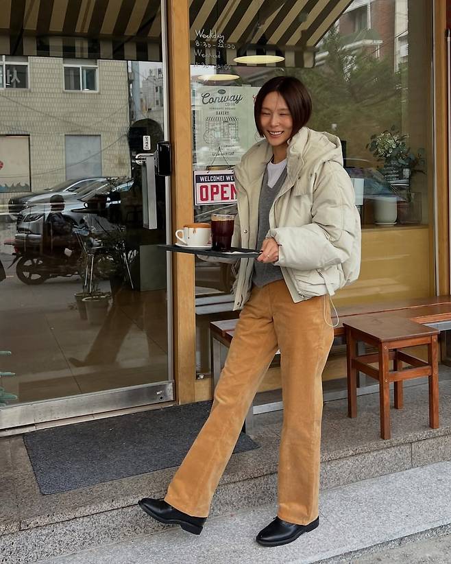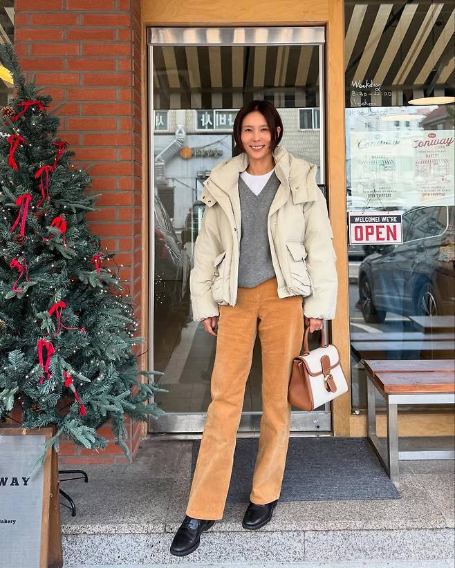 공개 된 사진 속 김나영은 화이트 티셔츠를 이너로 입고 그레이 컬러의 브이넥 니트를 입었다. 또한 브라운 컬러의 코듀로이 팬츠와 숏패딩을 입어 캐주얼한 스타일링을 선보였다. 브라운 컬러의 롱삭스와 블랙 로퍼를 신고 핸드백을 코디하여 꾸안꾸 겨울 스타일링을 자랑했다.