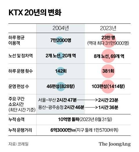 대표적인 기록이 지난해 8월 말의 누적 승객 10억명 돌파다. 우리 국민 한 사람당 20번 넘게 KTX를 탄 셈이다. 20년간 누적 운행거리도 6억 3000만㎞로 지구 둘레(4만㎞)를 1만 5000여 바퀴나 돈 것과 맞먹는다. 그 사이 국내선 항공과 고속버스 등은 경쟁에 밀려 고속철도에 자리를 내줘야만 했다. 그만큼 KTX가 우리 삶에 깊숙이 자리 잡았다는 반증이기도 하다.