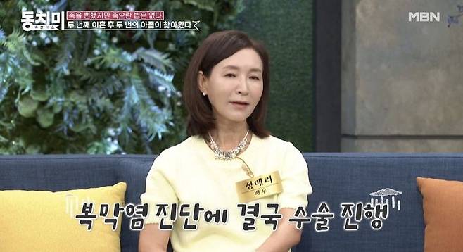 두 번의 이혼을 겪고도 일에 집중해온 정애리는 어느 날 갑작스러운 복통으로 응급실에 실려갔다.