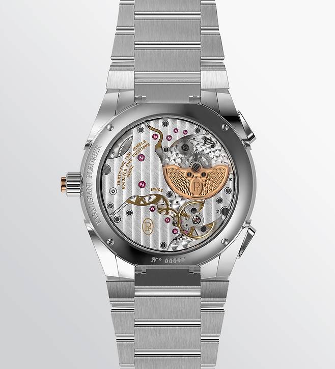 사파이어 크리스탈 케이스백으로 드러나는 무브먼트는 자동 인하우스 칼리버 PF052입니다. 톤다 PF 마이크로 로터에 사용하는 PF701을 베이스로 카운트 다운으로 활용할 수 있는 스플릿 메커니즘을 추가했습니다. 풀 로터와 달리 무브먼트 감상을 방해하지 않는 마이크로 로터 덕분에 정교하게 마감한 무브먼트의 미감이 그대로 전해집니다. 로즈 골드 로터 표면에는 다이얼과 같은 그랭도르주 패턴을 새겼습니다. 주요 스펙은 베이스와 동일합니다. 시간당 진동수는 21,600vph(3Hz), 파워리저브는 약 48시간입니다.