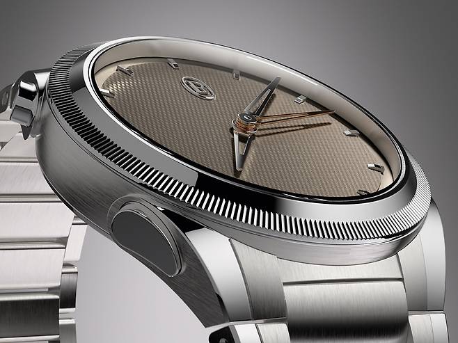 다이얼은 브랜드 이니셜로 바뀐 심플한 로고를 제외하면 어떠한 문구도 찾아볼 수 있습니다. 톤다 PF 초창기에는 이러한 미니멀리즘이 어색해 보이기도 했지만, 지금은 자리를 잡아가는 듯합니다. 샌드 그레이 컬러로 칠한 다이얼 표면에는 기존과 동일하게 그랭도르주(Grain d'Orge, 보리알) 패턴을 촘촘히 새겼습니다.