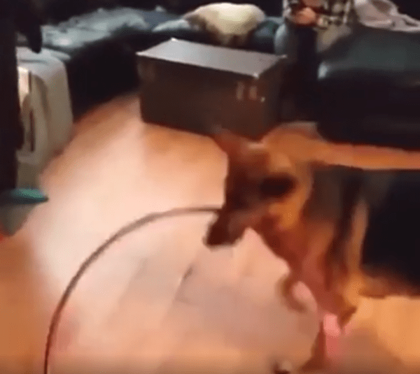 강아지는 곧장 훌라후프에 코를 갖다 대더니, 망설임 없이 입으로 덥석 물어버립니다. 돌던 훌라후프는 그의 방해로 툭—멈춰버리고, 여자는 당황 반 웃음 반의 표정으로 강아지를 바라봅니다. 그러나 이건 단지 시작이었죠. 그 순간, 훌라후프를 입에 문 강아지가 제자리에서 갑자기 빙글빙글 돌기 시작합니다.