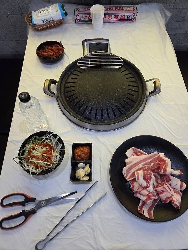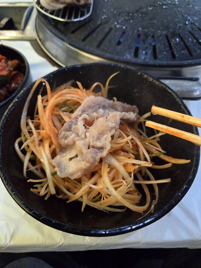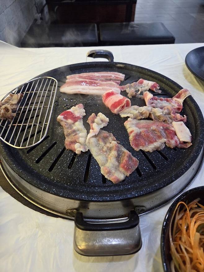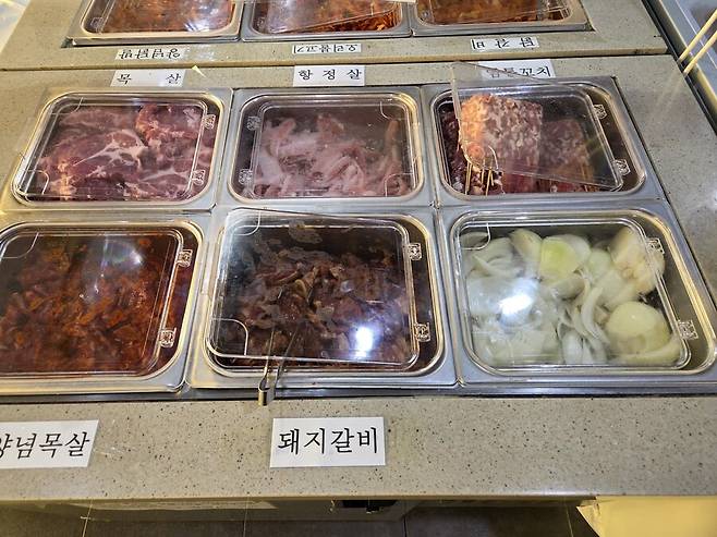 메뉴는 한식뷔페 + 위의 고기5종에 냉동 대패삼겹, 냉동 우삼겹, 냉동 돈두 항정살 추가