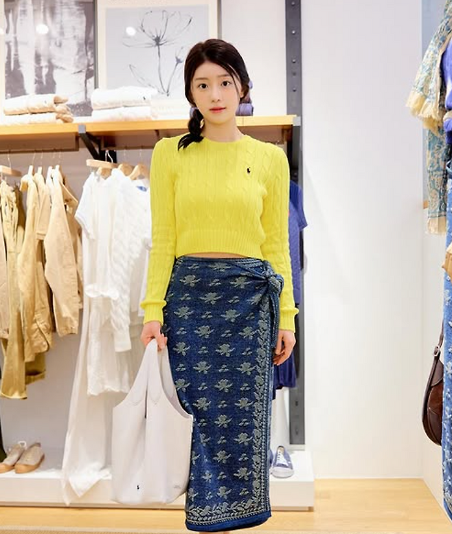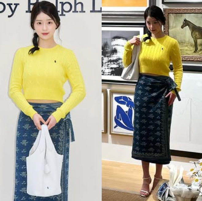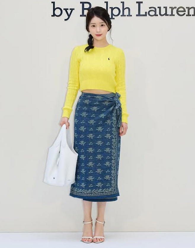 채서안 님은 최근 봄의 따사로운 기운이 물씬 느껴지는 산뜻한 일상룩을 선보였어요. 그녀는 개나리처럼 화사한 노란빛의 폴로 랄프로렌 니트를 중심으로, 독특한 패턴이 인상적인 스카프 스커트를 매치해 시선을 사로잡았죠.