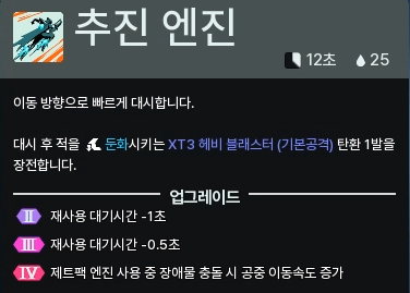 적을 밀치는 기능이 있으며, 밀쳐진 적이 벽에 닿을 시 기절 상태가 되는 추가 효과가 있지만, 노리고 쓰기는 쉽지 않습니다. 재빠르게 움직이는 칼바인이기에 들어오는 상대를 밀쳐 거리를 벌리는 느낌으로 써도 좋고, 상대 뒤로 파고 들어 아군에게 밀어주는 용도도 괜찮습니다. 다만 사거리가 항상 생각하는 것보다 짧기에 주력으로 쓰기는 미묘한 스킬입니다.
