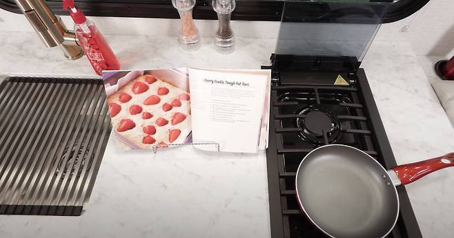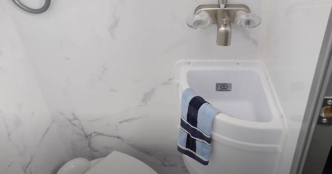 주방은 2구 가스레인지, 전자레인지, 상하부 수납장, 접이식 확장 조리대 등이 갖춰졌다. 냉장고는 주방과 욕실이 맞닿은 벽면에 설치됐으며, 그 옆에는 작은 옷장이 있다. 욕실은 샤워, 세면 등의 기능이 통합된 구조다. 비교적 넓은 공간 덕분에 사용 편의성이 높은 편이다.