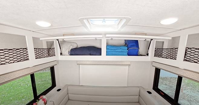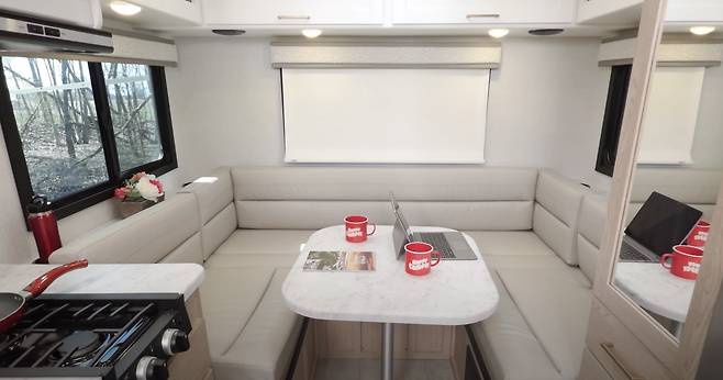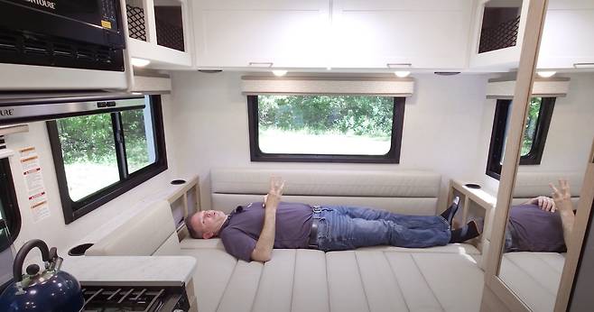 메인 침실 공간은 차량 후면에 마련된 U자형 다이넷으로, 주간에는 식사 및 휴식 공간으로 활용되며, 야간에는 테이블을 내리고 쿠션을 배치해 침대로 변환할 수 있는 구조다. 측면 쿠션 일부는 분리 가능해 머리 공간 확보에 유리하며, 하단 수납공간은 일상용품 보관에 적합하다. 상부 캐비닛도 넉넉해 옷, 식료품, 책 등 다양한 짐을 수납할 수 있다.