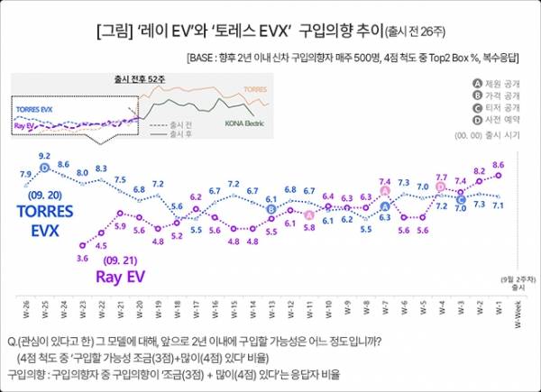 21일 공식 출시된 레이 EV는 출시 전 1주차(W-1)인 9월 2주(11일 시작 주) 구입의향 9%(이하 소수점 반올림)를 기록했다. 하루 앞서 20일 출시된 토레스 EVX 구입의향 7%를 2%포인트로 앞질렀다.