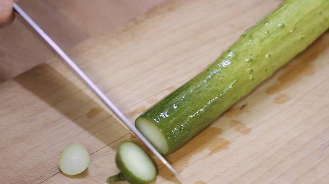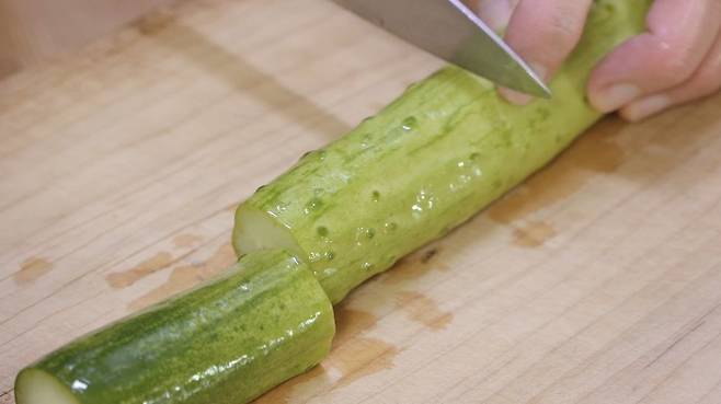 양끝을 조금 자르고 3~4등분으로 자르세요.
