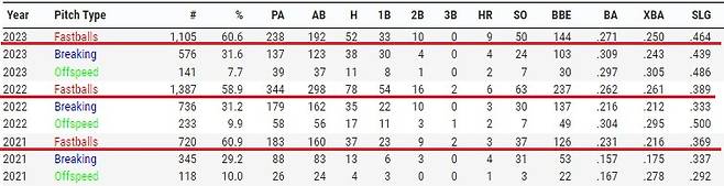 아래 표에서도 나타난다. 베이스볼 서번트가 집계한 투구별 상대 기록이다. 패스트볼에 대한 타율이 매년 올라간다. 0.231→0.262→ 0.271로 높아졌다. 홈런도 3개→6개→9개로 늘었다. 올해는 아직도 50게임 남짓 남았다.