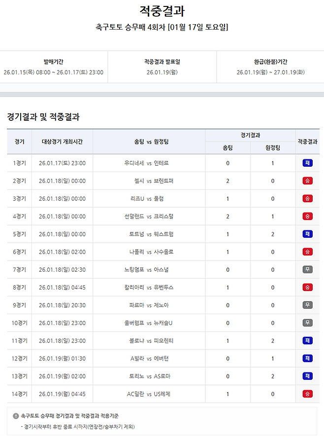 서울올림픽기념국민체육진흥공단(이사장 하형주)이 발행하는 체육진흥투표권 스포츠토토의 수탁사업자 한국스포츠레저㈜가 공식 인터넷 발매 사이트 '베트맨'을 통해 1월 17일(토)부터 19일(월)까지 진행된 잉글랜드 프리미어리그(EPL) 및 이탈리아 프로축구(세리에A) 14경기를 대상으로 발매한 축구토토 승무패 4회차의 적중 결과를 발표했다.