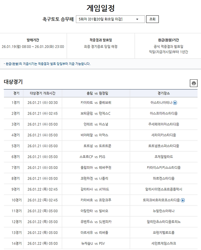 이번 회차에는 UEFA 챔피언스리그(UCL) 일정을 중심으로 ▲보되/글림트-맨체스터 시티(2경기) ▲인테르-아스널(3경기) ▲토트넘-도르트문트(5경기) ▲유벤투스-벤피카(12경기) ▲마르세유-리버풀(13경기) ▲뉴캐슬 유나이티드-PSV(14경기) 등 유럽 정상급 클럽 간 맞대결이 대거 포함돼 있다. 일부는 중립 경기로 치러질 예정이어서, 홈, 원정 요소 외에도 팀 전력과 최근 흐름을 종합적으로 고려한 분석이 요구된다.