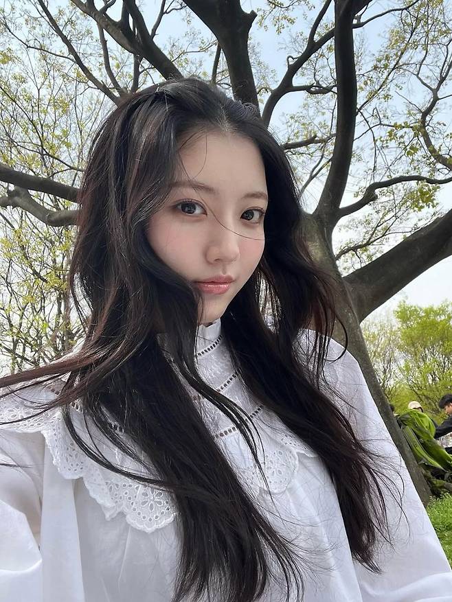 이번 정다빈의 착장은 화이트 컬러의 빅카라 블라우스를 중심으로 한 로맨틱 스타일이 핵심이다. 하늘하늘한 면 소재에 자수 디테일이 더해진 레이스 카라 블라우스는, 얼굴을 화사하게 밝혀주는 동시에 고풍스러운 무드를 자아낸다. 여기에 과하지 않은 웨이브 헤어스타일과 은은한 메이크업이 더해지며, 꾸미지 않은 듯 자연스러운 매력을 극대화했다. 특히, 나무 아래에서 촬영된 이번 셀카는 푸르른 자연과 어우러지며 한 편의 청춘 영화 같은 분위기를 연출한다.