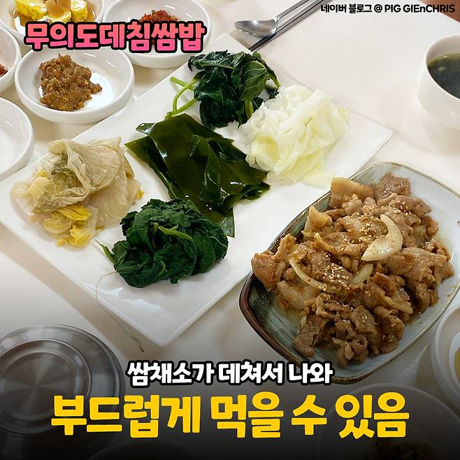데침쌈밥도 세트가 있는데 돼지불고기, 간장새우, 삼겹살로 다양하게 먹을 수 있고 쌈과 반찬은 계절에 따라 바뀔 수 있어요. 참고로 쌈과 반찬은 무한리필입니다~