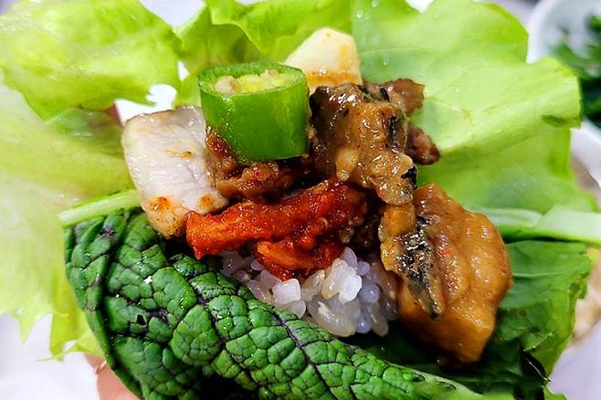 이곳은 이름에서 알 수 있듯이 쌈채소가 데쳐서 나와 쌈채소의 식감을 더욱 부드럽게 먹을 수 있답니다. 데침쌈 종류는 5가지 종류이고 여러가지 데침 쌈을 굴쌈장, 젓갈, 장아찌와 함께 먹는 건강식이에요!
