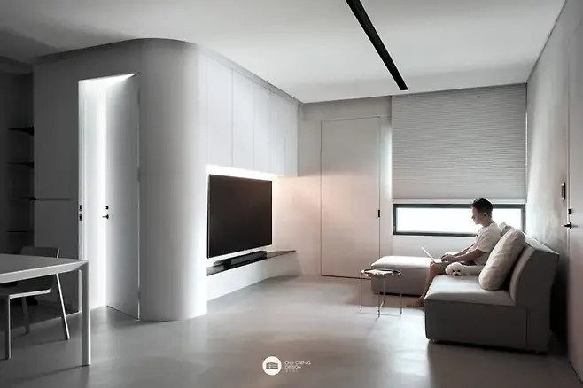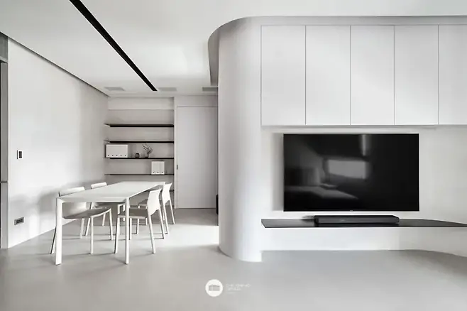 부드럽고 따뜻한 감성이 스며드는 공간이며, 아치형 TV 수납장과 간소한 선반으로 깔끔하고 여유 있는 분위기를 유지한다. 천장의 T자 블랙 라인이 공조와 간접조명을 통합한 구조라는 점도 눈길을 끈다.