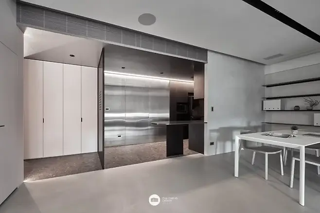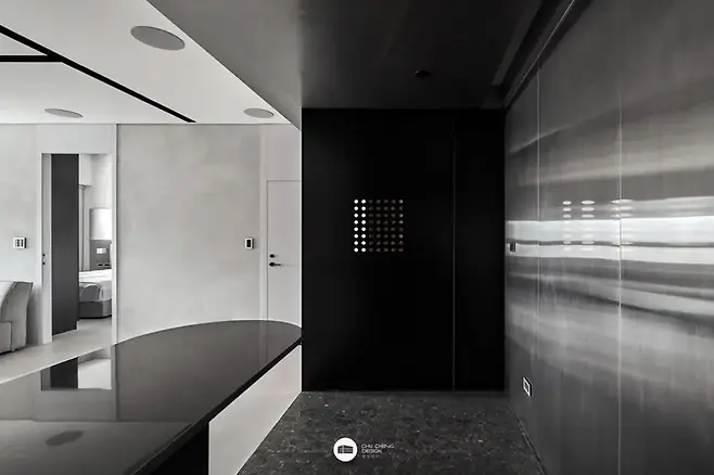 집의 첫 인상을 결정짓는 현관은 흑백의 대비가 빛나는 절제된 공간으로 설계되었다. 바닥은 톤 다운된 그레이 타일, 천장은 견고한 스테인리스로 마감해 도심의 리듬을 담아냈다.