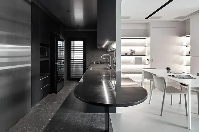 현관에서 자연스럽게 연결되는 주방은 열린 구조의 다이닝 키친으로 구성된다. 조리대는 인조석 상판이 부드럽게 곡선을 그리며 중간 아일랜드로 확장되어, 식사 공간이나 간단한 티타임 장소로도 활용된다.