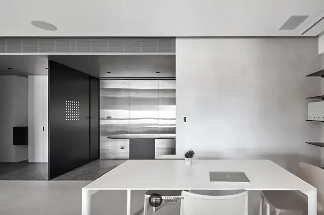 아일랜드 바 테이블 옆에 배치된 다이닝 공간은 심플한 흰색 식탁과 의자로 정돈된 인상을 준다. 눈여겨볼 점은 벽면에 숨겨진 프로젝터 스크린. 필요할 땐 홈시네마, 회의실, 공부방으로 변화한다.