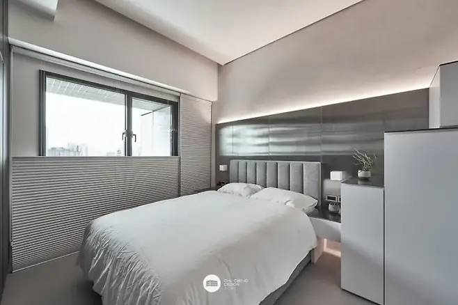 흰색 주름 커튼을 열면 햇살이 부드럽게 스며드는 침실은 공용 공간의 소재와 톤을 그대로 이어받아 집 전체의 일관된 디자인 흐름을 완성한다. 침대 헤드에는 회색 패브릭과 불규칙적인 스테인리스 패널이 함께 어우러져, 단순하지만 심심하지 않은 연출을 보여준다.