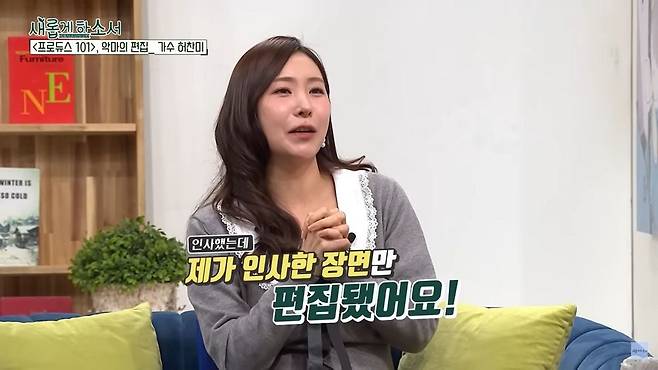 또한 허찬미는 “첫 녹화에서 들어가자마자 100명의 연습생에게 인사를 했고, 저를 알아본 친구들이 일어나서 ‘안녕하세요’를 했는데 제가 인사한 장면만 편집이 됐다”라며 “저는 100명의 친구들의 인사를 받지 않고 자리에 앉은 사람이 됐다”라고 ‘악마의 편집’ 탓에 인성 논란이 불거졌다고 토로했다.