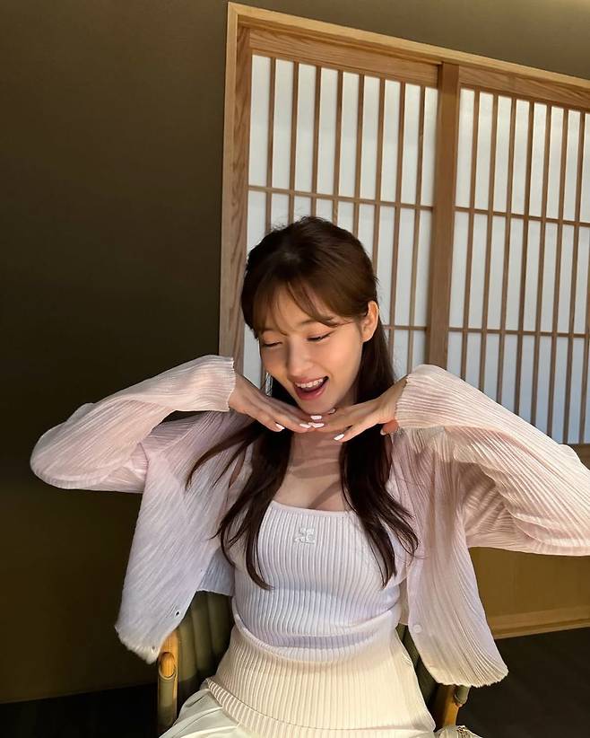 첫 번째 룩은 파스텔 옐로의 버튼업 가디건과 아이보리 톤의 하이웨이스트 팬츠를 매치한 셀피 컷으로, 조수민 특유의 청순하면서도 산뜻한 무드가 담겼다. 부드러운 라운드넥과 살짝 여유 있는 실루엣은 일상 속 데일리룩으로도 손색없다.