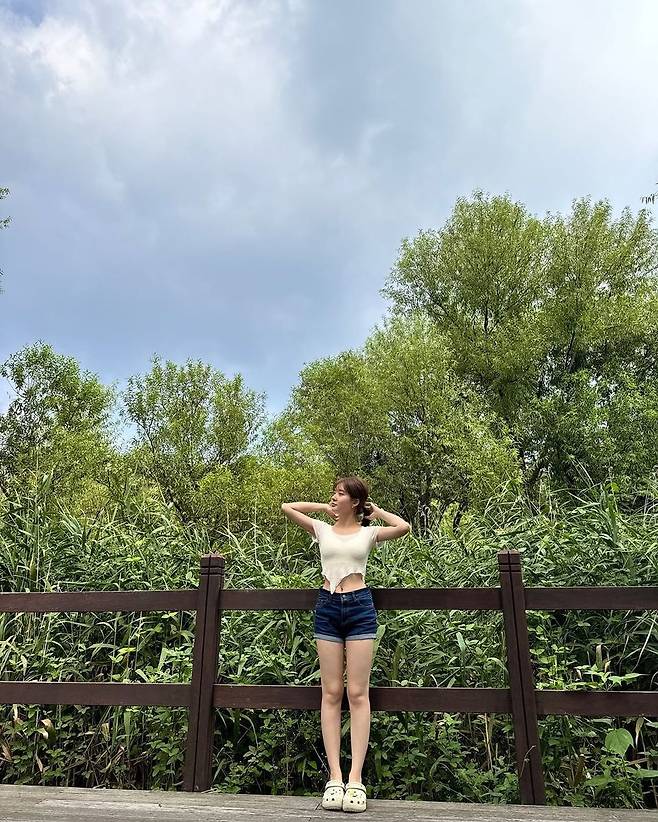 마지막으로, “여름아 얼른 와랏”이라는 멘트와 함께 공개된 야외 숏팬츠 룩은 본격적인 썸머 바이브를 예고한다. 크롭한 화이트 티셔츠와 데님 쇼츠, 크록스 스타일의 슬리퍼는 편안하면서도 트렌디한 감각이 돋보이는 조합으로, 여름 휴양지 스타일링에 참고할 만한 룩이다.