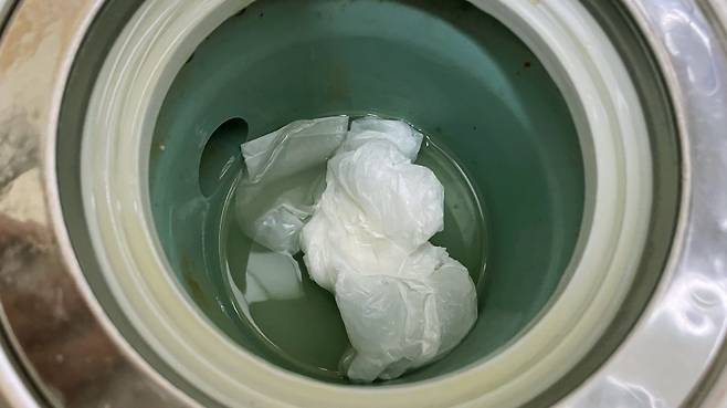 일단 배수구에 물이 빠져나가지 않게 비닐봉지로 배수구 구멍을 막아주세요!