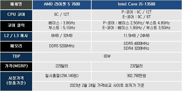 주인공은 AMD 라이젠 5 7600와 인텔 코어 i5-13500이다.