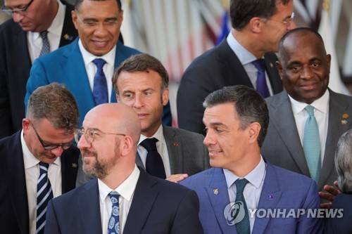 epa10751988 French President Emmanuel Macron (C) and Spanish Prime Minister Pedro Sanchez (R) arrive at the podium prior to European Leaders and Leaders of the CELAC pose for the family photo during the EU-CELAC Summit of Heads of State and Government in Brussel, Belgium, 17 July 2023. Leaders from the EU and the Community of Latin American and Caribbean States (CELAC) gather in Brussels for the third EU-CELAC summit from 17-18 July 2023, with the aim to strengthen relations between both regions. EPA/OLIVIER MATTHYS