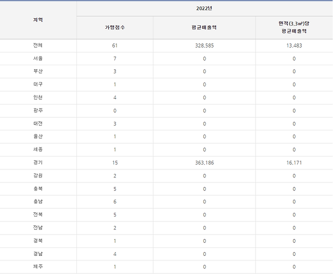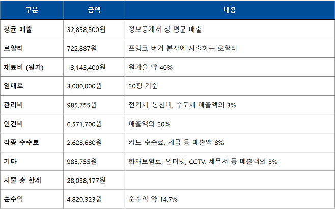- 프랜차이즈 가맹점의 1년 평균 매출액은 328,585천 원으로, 이를 12개월로 나누면 월 평균 매출액은 27,38만 원입니다.