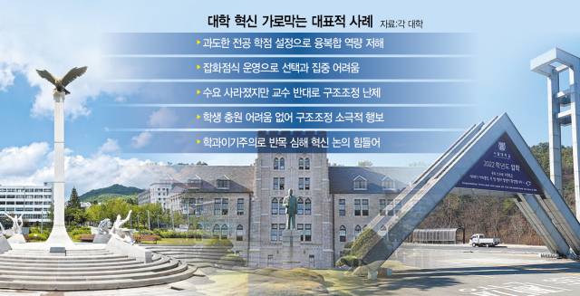 특히 혁신을 선도해야 할 소위 주요 대학들이 지방대와 달리 충원난을 겪지 않아 구조 조정에 미온적이다. 지방대는 살아남기 위해서라도 구조 조정을 밀어붙이고 있다. 하지만 주요 대학들은 교수 등 학내 저항까지 감수해가며 구조 조정을 추진하기가 쉽지 않다. 발등에 불이 떨어지지 않는 한 교육 환경 변화에 선제 대응도 못 하고 있다.