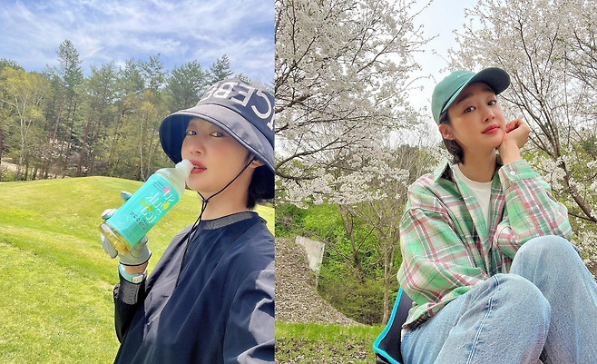 체크 패턴의 셔츠와 데님 팬츠를 조합한 봄철 아웃도어 룩을 선보이고 있다. 그린 톤이 포인트로 들어간 체크 셔츠는 화사한 봄 분위기를 자아내며, 캡과 함께 매치해 활동적이면서도 트렌디한 스타일을 완성했다. 벚꽃이 만개한 배경과 어우러져 계절감을 살린 패션 센스를 드러내고 있다.
