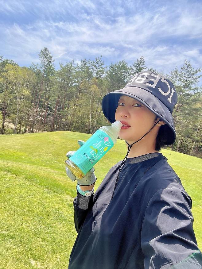 검은색 오버사이즈 상의와 버킷햇을 활용한 스포티한 스타일을 연출하고 있다. 넓은 잔디밭에서 음료를 마시는 모습으로, 편안하면서도 스타일리시한 아웃도어 패션을 보여준다. 특히 버킷햇의 한글 로고가 포인트가 되어 개성 있는 룩을 완성하고 있다.