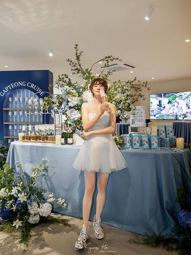 화이트 튤 소재의 미니 드레스로 우아하고 로맨틱한 스타일을 선보이고 있다. 오프숄더 디자인의 드레스는 여성스러움을 극대화하며, 플로럴 장식이 가득한 이벤트 공간에서 세련된 파티 룩을 연출하고 있다. 깔끔한 화이트 컬러로 순수하면서도 고급스러운 이미지를 완성했다.