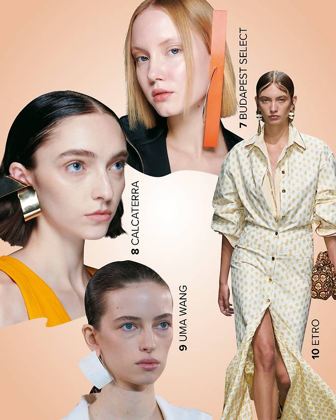 8 존재감이 강한 메탈 소재의 빅 이어링을 선택했다면 자연스러운 메이크업과 깔끔하게 쓸어 넘긴 슬릭 헤어로 액세서리를 강조한다.