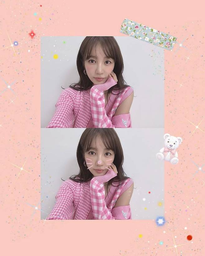 사진 편집에서도 윤은혜 특유의 감성이 느껴졌다. 반짝이는 스팽글 배경과 귀여운 곰돌이 스티커, 플라워 마스킹테이프 등의 요소가 더해져 마치 한 편의 일러스트 엽서를 보는 듯한 느낌을 준다. 특히 두 번째 사진 속에는 귀여운 고양이 수염 낙서가 더해져, '핑쿠\~\~\~\~'라는 그녀의 인스타 캡션을 더욱 귀엽게 받쳐준다.