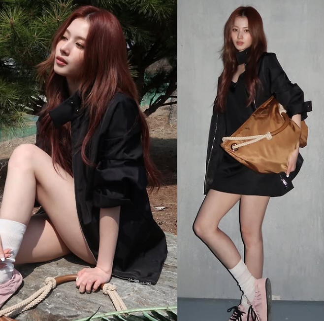 블랙 자켓과 블랙 원피스를 매치해 깔끔한 모노톤 룩을 연출했는데요. 자칫 심심할 수 있는 블랙 코디에 브라운 컬러의 빅사이즈 백을 더해 포인트를 주고, 핑크색 스니커즈로 사랑스러운 분위기를 더해 스타일링의 재미를 놓치지 않았답니다. 시크함과 러블리함이 공존하는, 딱 사나 님다운 감각적인 일상룩이었어요.