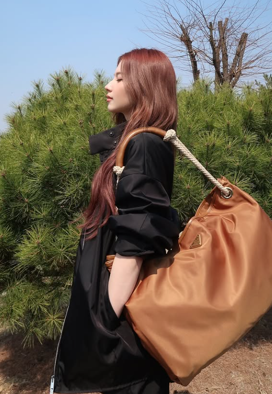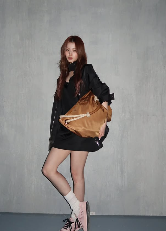 사나 님 룩에서 가장 눈길을 끈 아이템 중 하나는 단연 브라운 컬러의 빅사이즈 백이에요. 큼직한 사이즈 덕분에 실용성도 살렸고, 블랙 의상 속에서 따뜻한 브라운 톤이 포인트처럼 살아나 룩 전체에 따뜻한 무드를 더했답니다.