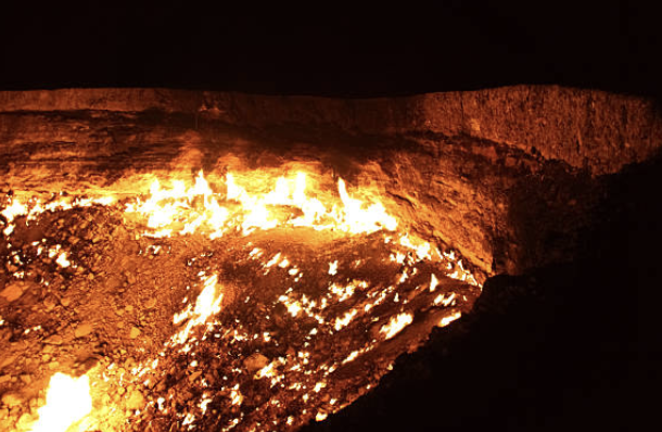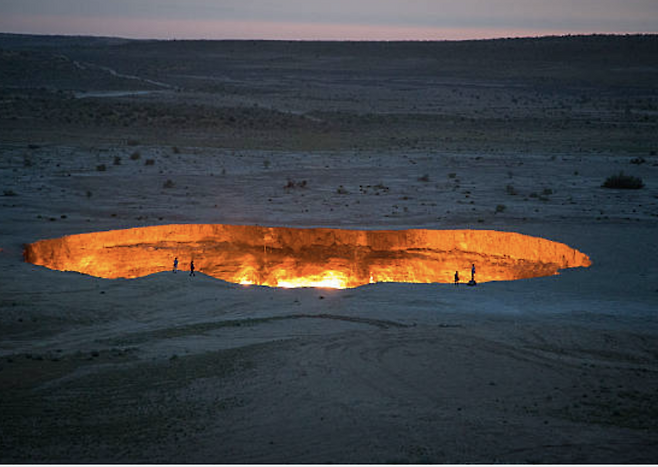 칠흑 같은 어둠이 깔린 사막 한복판, 멀리서부터 지평선을 붉게 물들이는 기이한 불빛이 보입니다. 가까이 다가가면 지름 70m에 달하는 거대한 구덩이 속에서 뜨거운 화염과 열기가 뿜어져 나오는데요. 마치 지옥으로 향하는 입구 같다고 해서 '지옥의 문'이라 불리는 이곳, 투르크메니스탄의 다르바자 가스 분화구입니다.