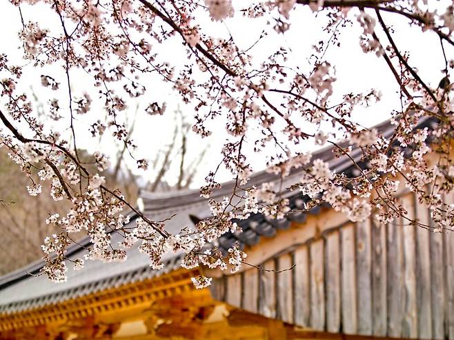대웅전과 명부전 주변에 핀 벚꽃은 불상과 어우러져 마치 부처님도 봄의 기쁨을 함께 나누는 듯한 감동을 준다.