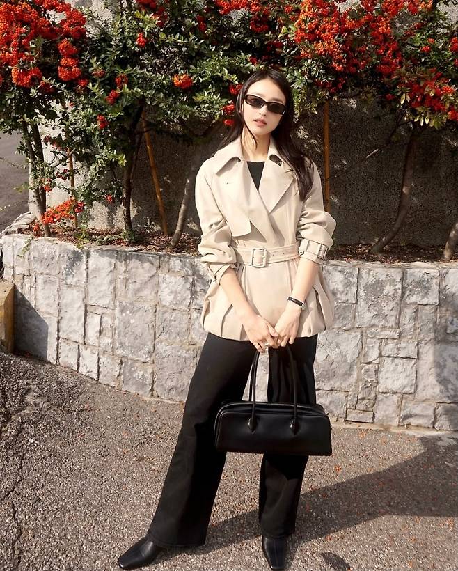 베이지 톤의 트렌치코트에 블랙 팬츠를 매치해 심플하면서도 완성도 높은 스타일링을 선보였습니다.