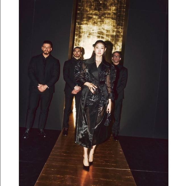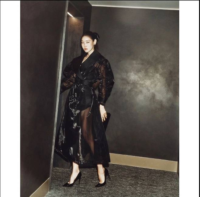 한혜진은 블랙 시스루 트렌치코트를 착용해 고급스럽고 세련된 패션을 선보였습니다.