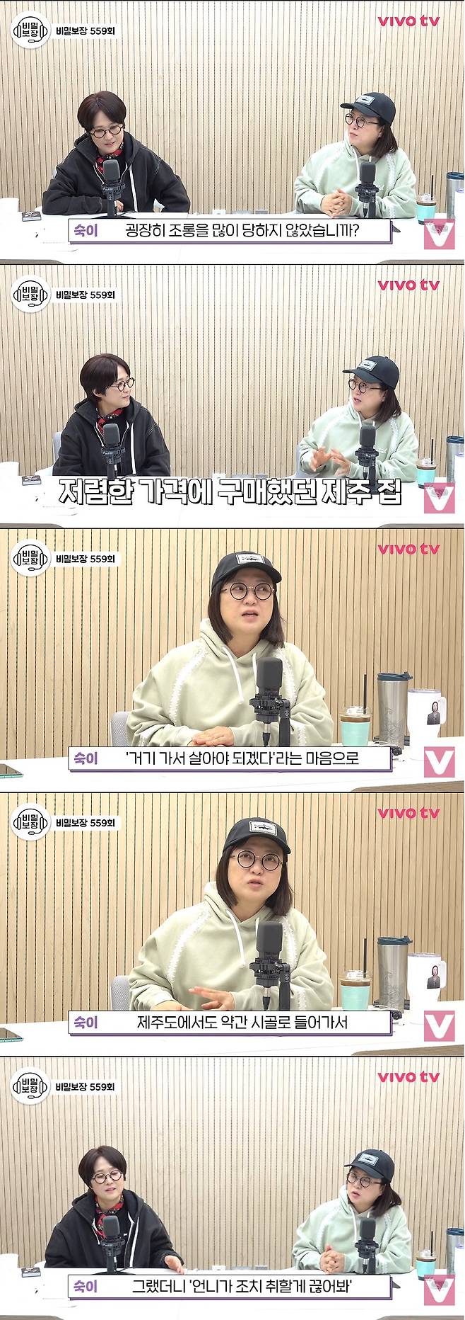김숙은 "비보 시작하기 전에 샀던 가장 저렴하게 샀던 집이다. 일이 없어서 거기 가서 살아야겠다는 마음으로 제주도에서도 시골로 들어가서 샀던 집"이라며 "그 집이 운이 좋았는지 그 집에 다녀오면 확실히 일이 많았다. 그래서 너무 바빠졌다. '비보'를 하게 되고 '님과 함께'를 시작하면서 일이 너무 많아져서 결국 제주도를 못 가고 있다가 '이제는 때가 됐다. 이 집을 고쳐서 공유 별장으로 만들어야겠다'(고 결심했다)"고 밝혔다.