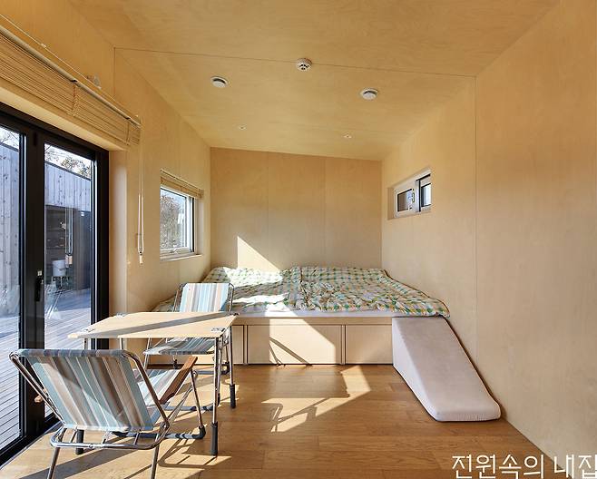 내부 역시 자작나무 합판 등을 적용해 전체적으로 편안하고 아늑한 분위기를 조성했다. 또한 건축주의 의견을 반영해 침실에는 2층 침대보다는 크기가 큰 침대를 배치하고 그 아래를 넉넉한 수납공간으로 활용할 수 있도록 했다.