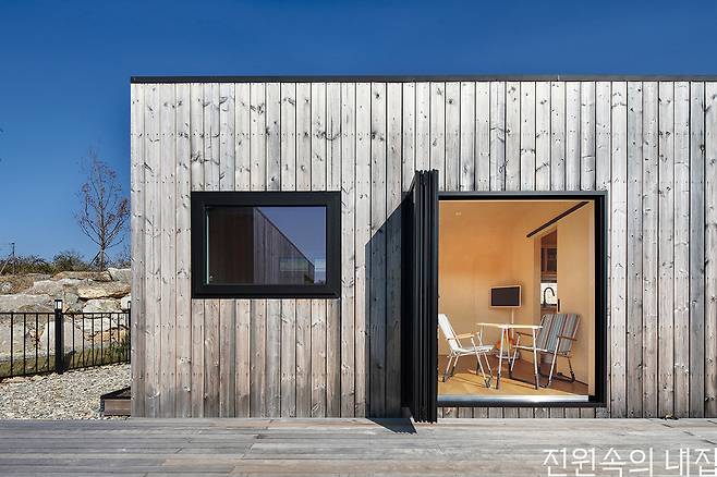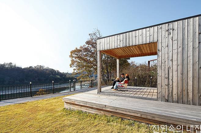 이 집의 특징은 3평 크기의 처마와 자연스럽게 회색빛으로 에이징된 루버이다. 이동식 주택의 특성상 처마를 설치하는 것이 쉽지는 않았지만, 실내외의 연계 공간이 되는 이 3평의 처마 덕분에 덥거나 비가 오는 날씨에도 강을 편안하게 조망할 수 있다.