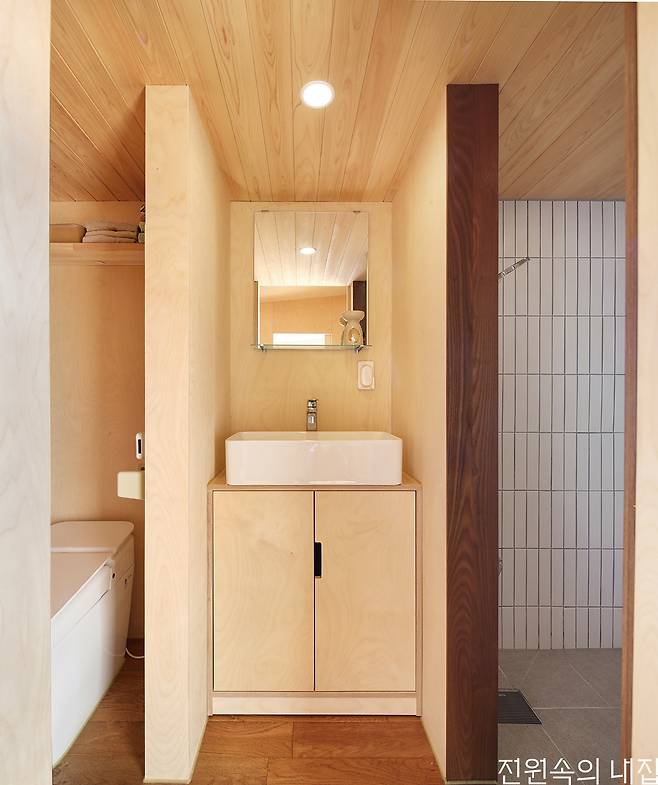 욕실 : 타일, 히노끼무절루버, 아메리칸스탠다드 비데 일체형 변기 가구 : 자체 제작(상판 : 애쉬, 하부 : 자작나무 합판)