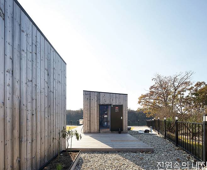 외벽은 자연과 조화를 이루도록 천연 목재를 사용했다. 고내구성 투습방수지가 방수 역할을 하고, 레인 스크린 시스템을 통해 마감재로 쓰인 목재가 숨 쉴 수 있게 했다.