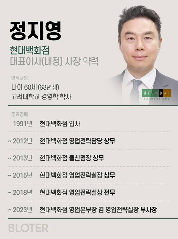 정 신임 대표는 정통 ‘현대백화점 맨’이자 영업 전략 전문가로 평가받는다. 고려대에서 경영학 학사를 취득한 정 신임 대표는 1991년 현대백화점에 입사해 32년간 마케팅·영업 분야에 몸담았다. 2010년 영업전략실 산하 마케팅팀장에서 영업전략담당 상무보로 승진한 이후 영업전략담당 상무, 울산점장, 영업전략실장 전무, 영업본부장 겸 영업전략실장 부사장 등을 역임했다.
