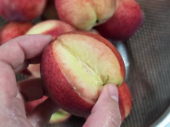지금 딱 제철이라 살은 단단하고, 당도는 높고, 향도 진해서 그야말로 최고의 복숭아 상태예요.